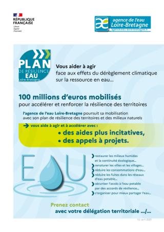 Feuillet recto-verso de présentation du plan de résilience Eau Loire-Bretagne. Un plan pour aider tous les porteurs de projets à agir face aux effets du dérèglement climatique sur la ressource en eau. 100 millions d'euros sont mobilisés pour accélérer et renforcer...